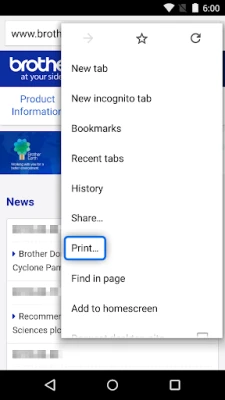 The Brother Print Service Plugin enables you to print directly from your Android devices (Android 5.0 or later), to your Brother printer through a Wi-Fi network. As this is a plugin application, you can print using the "Print" option of supported Android apps. Please see below for supported applications (as of March 2015):