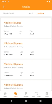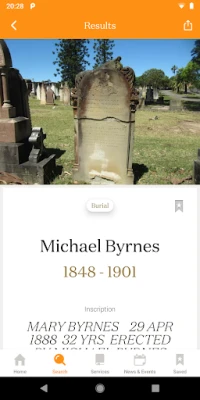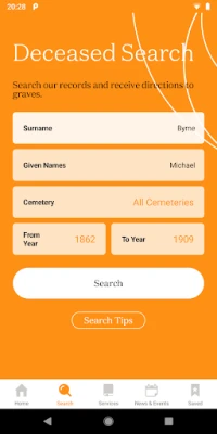 A simple screen allows users to search and find a deceased relative. Once identified, further information about where they are buried, their memorial and directions to the graveside are provided.