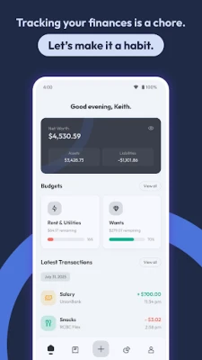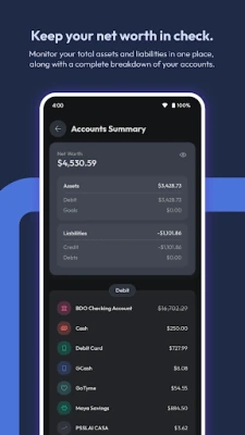 • View your net worth, assets, and liabilities along with a detailed and customizable breakdown of your accounts.