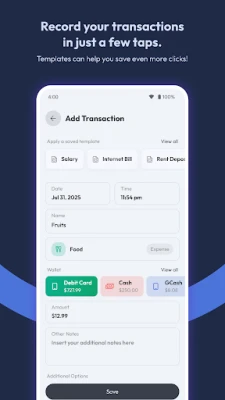 • Record your income, expenses, and money transfers in seconds!