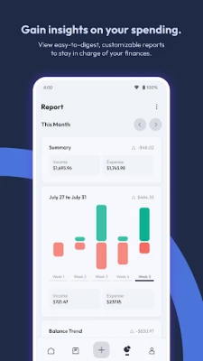 • Visualize and analyze your spending habits and earnings with detailed and flexible financial reports.
