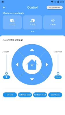 - Displays the machine's current position, and allows you to set the zero point, zero the software/hardware, move the axis, and adjust the laser focus.