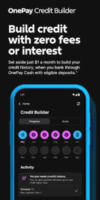 +Based on a 12 month loan with $25 monthly payments and a 0% APR. You can choose how much you’d like to pay towards your monthly payment, with a minimum of $1. If you choose an amount less than the full monthly payment, the remainder will be paid from the loan proceeds held in your Credit Builder lockbox. Use of the Credit Builder Program does not guarantee that your credit score will improve. Credit score improvement is dependent on your specific circumstances and a variety of factors, including your financial behavior. Failure to make monthly minimum payments on time may negatively impact your credit score. See onepay.com/legal/licenses.