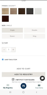With this app, you can: - Create a registry quickly and easily - Use your smartphone camera to add items to your registry in-store - Keep track of how many items you have left in your registry and what has been purchased Pottery Barn inspires customers to create homes that are comfortable, beautiful and true to their personal style. We offer timeless, high-quality furniture and decor in a variety of sizes and aesthetics, and provide fresh ideas that make the home-decorating process easy and rewarding. From the artists who design products in our San Francisco studios to the stylists and master craftspeople we employ around the world, we work every day to help others make their homes for life.