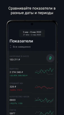 — Все важные показатели в виде графиков: выручка, прибыль, средний чек, количество гостей и количество чеков. Смотрите их в динамике по выбранным периодам.