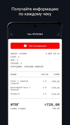 — Полная информация по каждому чеку: количество гостей, детали заказа, имя официанта, сумма скидки, отмена пречека и другое.