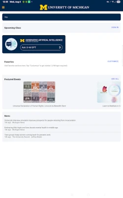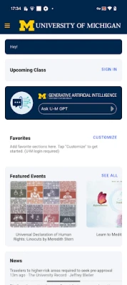 The Michigan App provides in-app messages and reminders related to academic life, personalized class schedule information, search based on places (campus buildings) and people (faculty, staff and students), location-based content including bus stops, parking locations and dining halls, and featured university events.